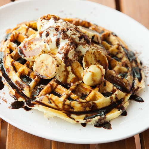 Waffle with chocolate sauce and banana.